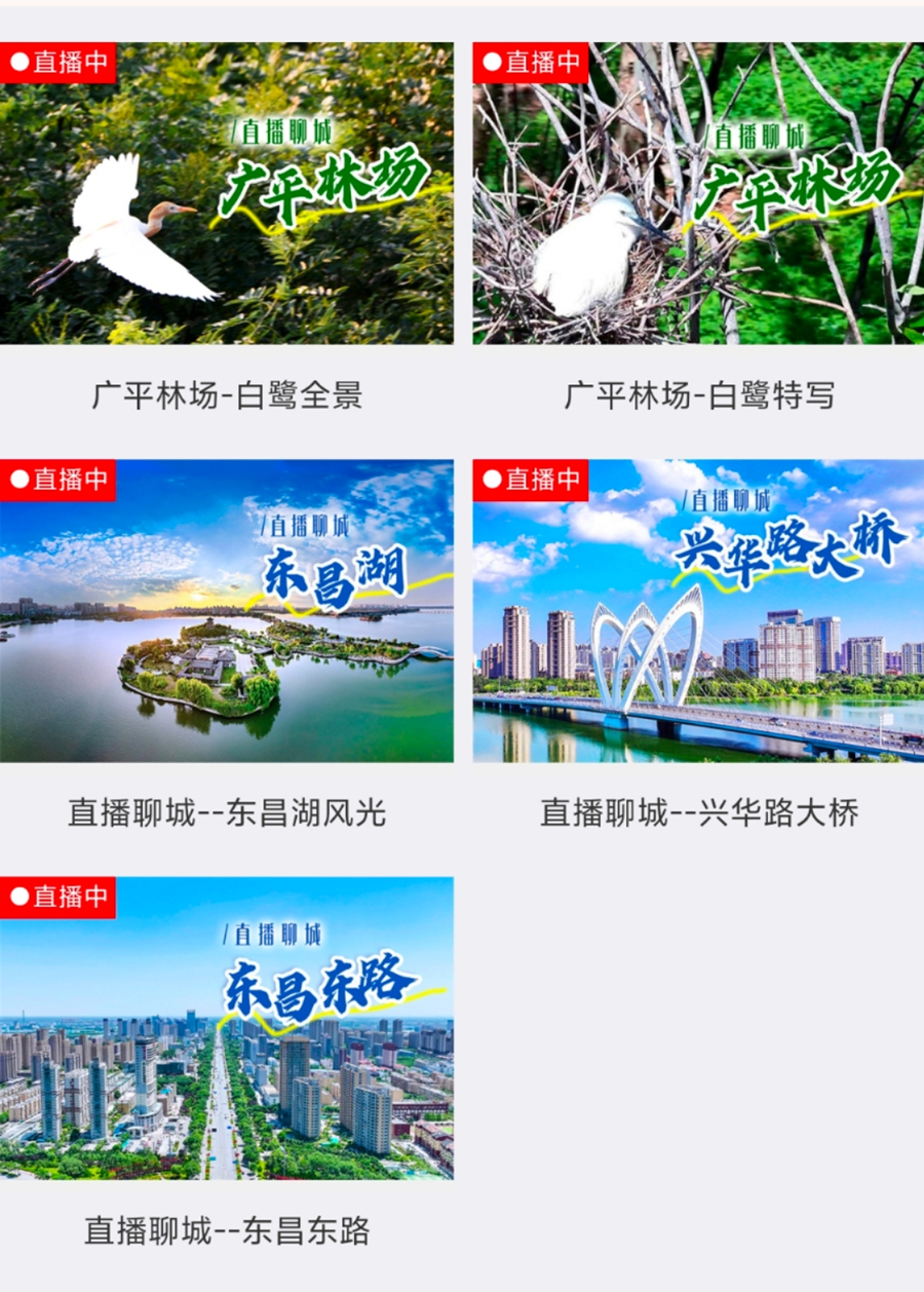 “直播聊城”首批上線4個慢直播場景:東昌湖、東昌東路、興華路徒駭河大橋、茌平區國有廣平林場。這4個慢直播場景各有特色,給用戶打造了一個“足不出戶看風景、一端在手賞大片”的曼妙感官體驗。在這里,您可以靜靜欣賞東昌湖碧波蕩漾的溫柔,享受微風拂過水面的靜謐,可以觀看東昌路上的車水馬龍,感受城市發展的脈搏,可以流連興華路徒駭河大橋上的璀璨燈光,見證光影交織的夢幻,還可以近觀茌平區國有廣平林場白鷺筑巢,體會人與自然和諧共生的美好。